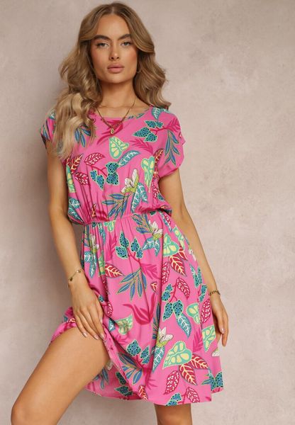 Różowa Rozkloszowana Sukienka Mini z Gumką w Talii z Wiskozy w Kwiaty Miola