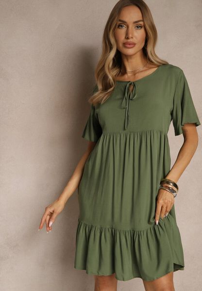 Ciemnozielona Bawełniana Sukienka Rozkloszowana z Wiązaniem przy Dekolcie Mepova