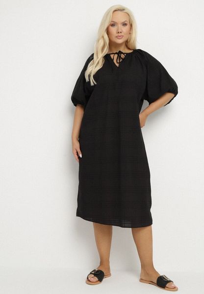 Czarna Bawełniana Sukienka Oversize z Wiązaniem pod Szyją Tolanea