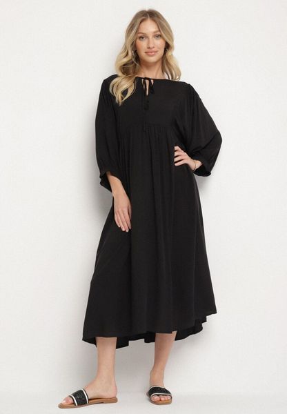 Czarna Rozkloszowana Sukienka z Wiskozy z Wiązaniem przy Dekolcie Tilania
