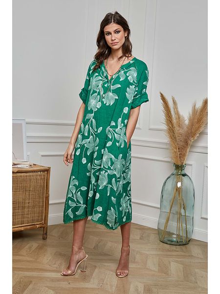 – czysty len- dekolt: V- kieszenie: wpuszczane- krój: luźny- wzór: kwiatowy