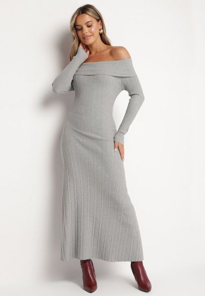 Szara Rozkloszowana Sukienka z Wiskozą i Odkrytymi Ramionami Siannela
