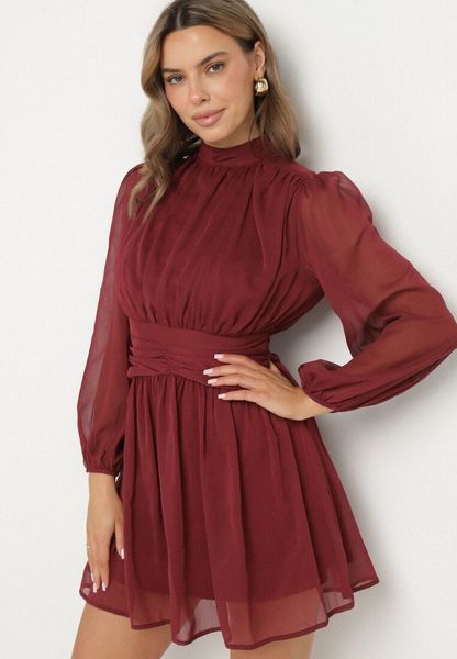 Bordowa Sukienka Rozkloszowane ze Stójką Marszczeniami i Transparentnymi Ramionami Belabria