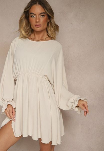 Jasnobeżowa Rozkloszowana Sukienka z Gumką w Talii i przy Mankietach Tesunela