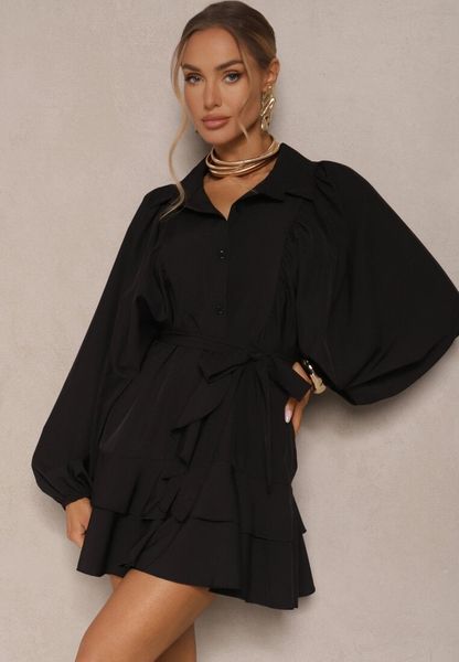 Czarna Rozkloszowana Sukienka z Falbanami i Paskiem Divanessa