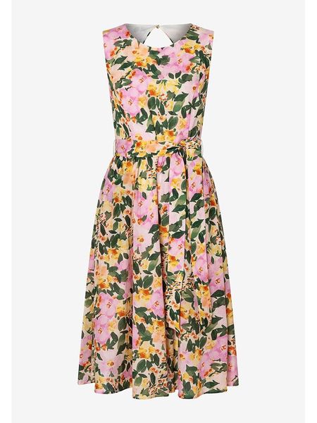 – ramiączka: szerokie- dekolt: okrągły- zapięcie: guzik na plecach- szlufki na pasek: tak- zdejmowany pasek: tkanina- detale: ozdobna zakładka- krój: litera A- wzór: kwiatowy