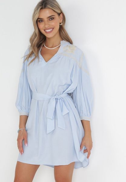 Niebieska Pudełkowa Sukienka z Haftem i Wiązanym Paskiem Corothee