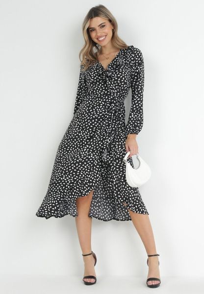 Czarna Kopertowa Sukienka w Kropki z Falbankami Kaikiran