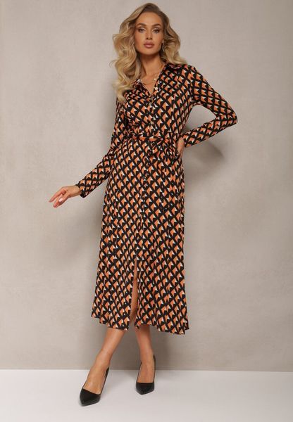 Pomarańczowo-Czarna Sukienka Koszulowa Rozkloszowana Burrus