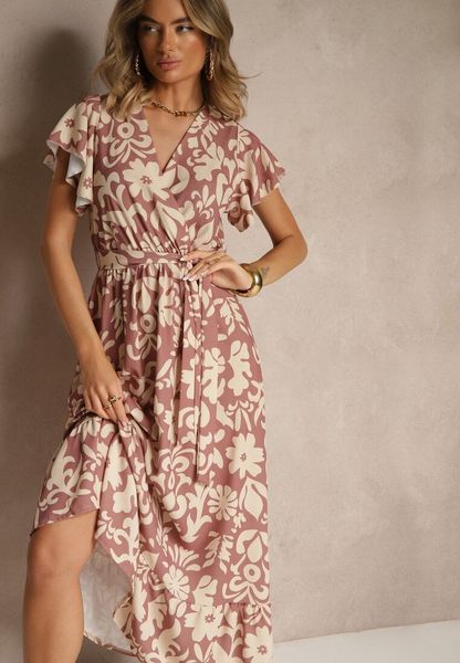 Ciemnobeżowa Rozkloszowana Sukienka w Kwiatowy Wzór z Paskiem Niloreia