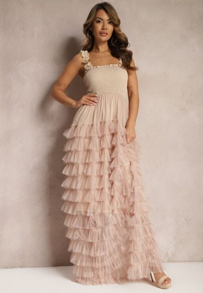 Beżowa Koktajlowa Sukienka Maxi z Tiulowymi Falbankami Amiusa
