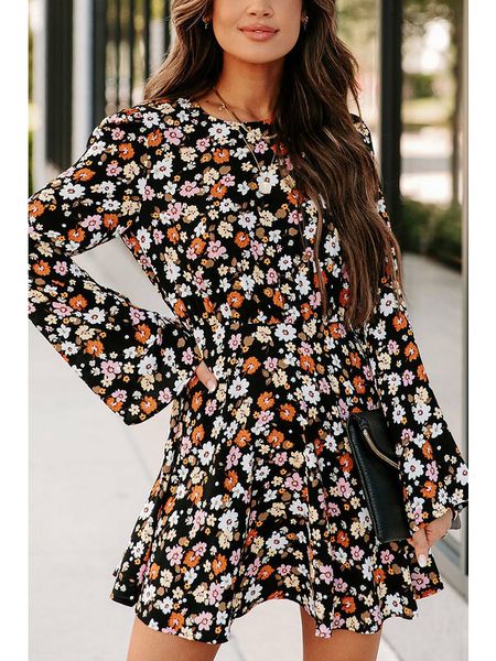 – dekolt: okrągły- krój rękawów: rozszerzany do dołu- krój: litera A- wzór: kwiatowy