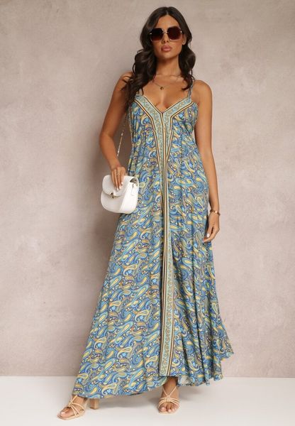 Niebieska Rozkloszowana Sukienka Maxi Wiązana na Szyi z Wiskozy z Printem Paisley Olympie