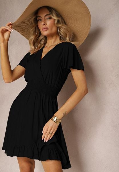 Czarna Sukienka z Bawełny z Gumką w Pasie z Dekoltem w Serek i Falbankami Quola