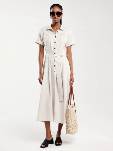 Sukienka damska midi lniana z wiązaniem w pasie beżowa Okire 800