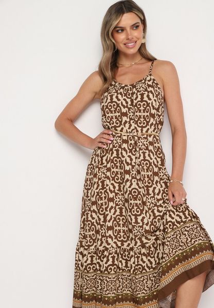 Brązowa Bawełniana Sukienka o Rozkloszowanym Kroju na Cienkich Ramiączkach Nellarra