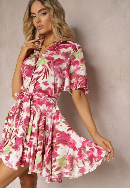 Różowo-Biała Sukienka z Falbankami Zapinana na Guziki z Materiałowym Paskiem i Krótkim Rękawem Uvinara