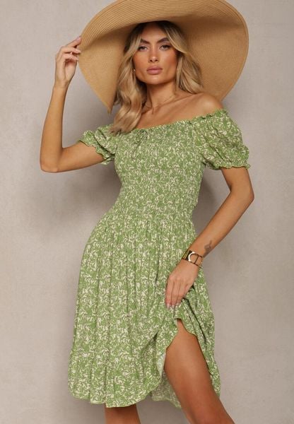 Jasnozielona Rozkloszowana Sukienka Bawełniana w Kwiaty z Hiszpańskim Dekoltem Xallona