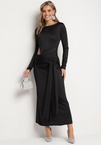 Czarna Sukienka Koktajlowa Ozdobiona Wiązaniem i Wycięciem Vamizola