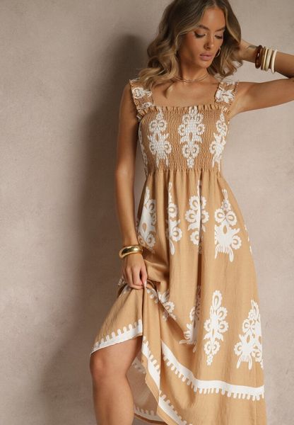 Ciemnobeżowa Rozkloszowana Sukienka z Wiskozy z Ornamentnym Motywem Aloxe