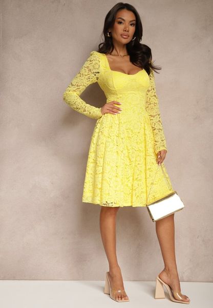 Żółta Taliowana Sukienka z Koronki z Rozkloszowanym Dołem Teladriela