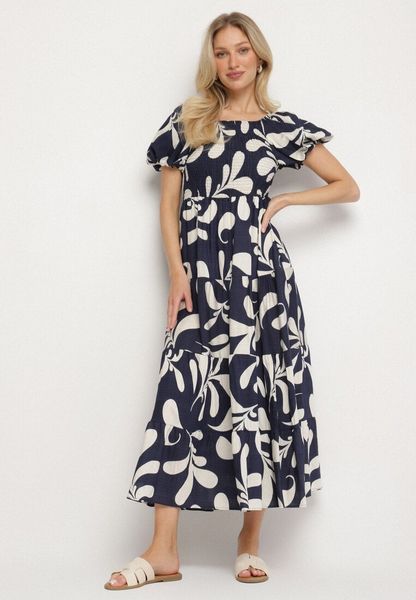 Granatowa Rozkloszowana Sukienka z Elastyczną Górą i Bufiastymi Rękawami Orrivene