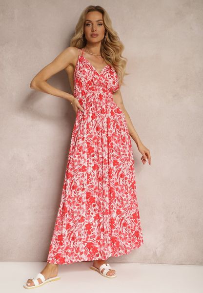 Czerwona Wiskozowa Sukienka na Lato z Podwójnymi Ramiączkami w Kwiatki z Gumką w Talii Triaire