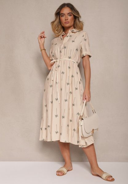 Beżowa Koszulowa Sukienka z Wiskozy o Rozkloszowanym Kroju z Wiązaniem Liselithra
