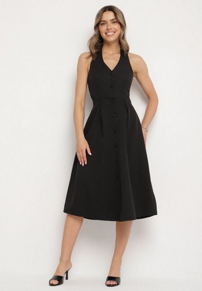 Czarna Sukienka na Szyję z Ozdobnymi Guzikami Folorea