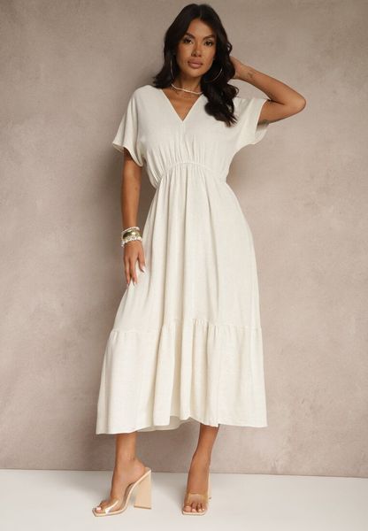 Jasnobeżowa Sukienka z Wiskozą i Lnem z Wiązaniem z Tyłu Kolissea