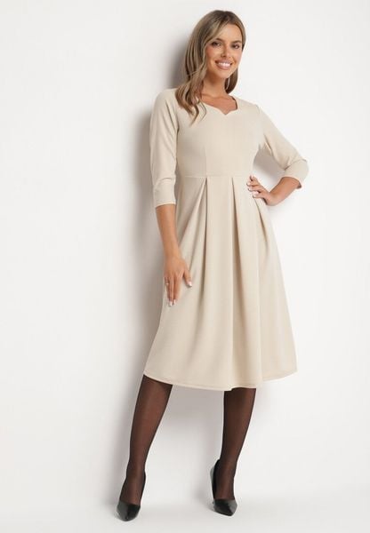 Beżowa Rozkloszowana Sukienka z Rękawem 3/4 Nomiel