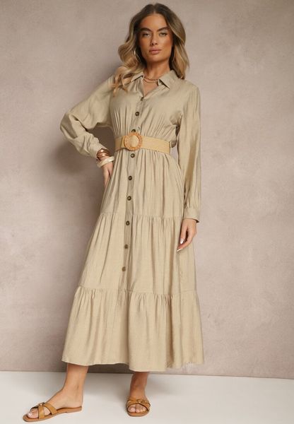 Beżowa Wiskozowa Sukienka o Koszulowym Kroju z Paskiem z Klamrą Feluriela