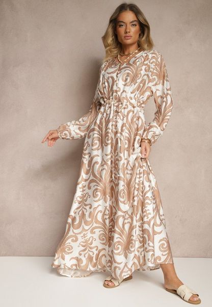 Jasnobeżowa Sukienka z Wiskozą o Rozkloszowanym Kroju w Abstrakcyjny Print Ridirinda