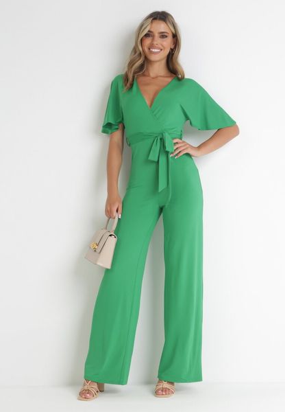 Zielony Długi Kombinezon z Kopertowym Dekoltem i Ozdobnym Wiązaniem Abrarani