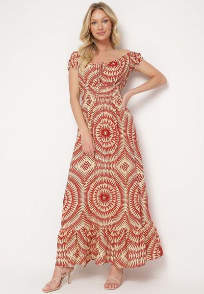 Beżowo-Czerwona Wiskozowa Sukienka o Rozkloszowanym Kroju z Wiązaniem przy Dekolcie i Gumką w Talii Wicia