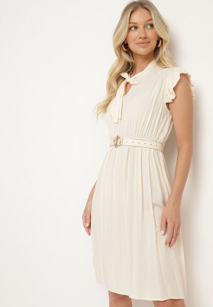 Jasnobeżowa Rozkloszowana Sukienka z Wiązanym Dekoltem i Gumką w Pasie Ozdobiona Falbanką Dimonima