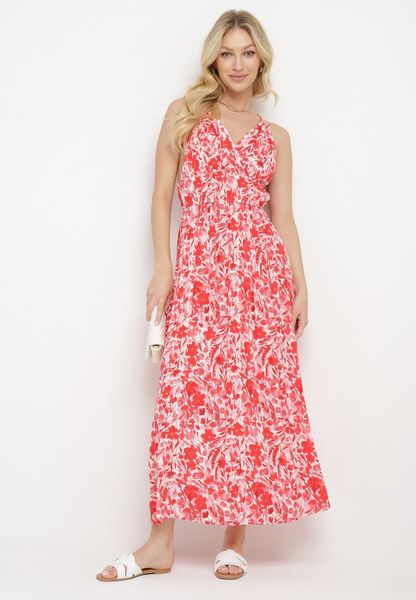 Czerwona Letnia Sukienka z Wiskozy w Kwiatki z Ozdobnymi Ramiączkami i Gumką w Pasie Triagena