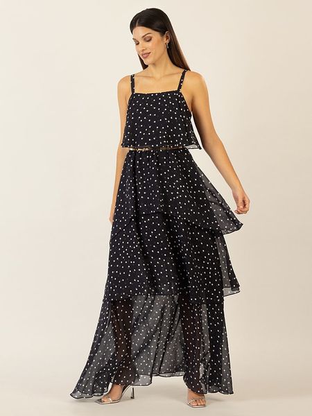 – ramiączka: regulowane- dekolt: karo- zapięcie: suwak na plecach- zdejmowany pasek: metal- detale: tiul- krój: prosty- wzór: kropki- look: warstwy