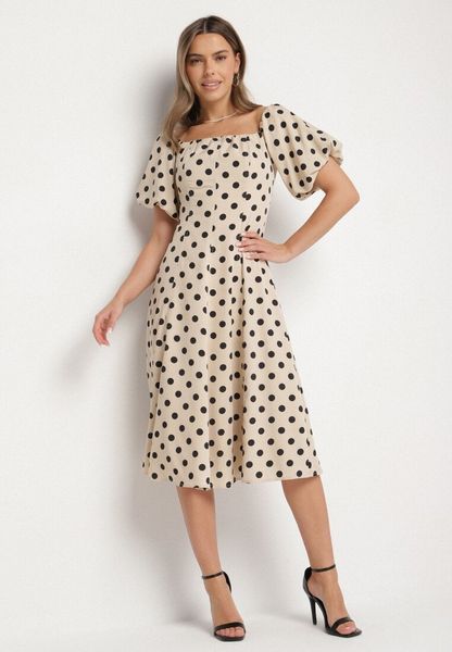Beżowa Rozkloszowana Sukienka Vices w Grochy z Dekoltem Typu Hiszpanka Zimina