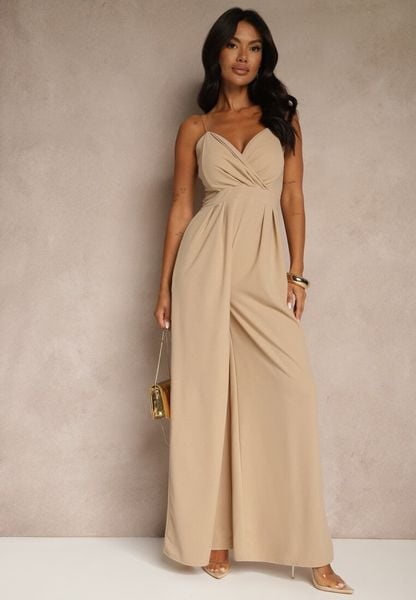 Ciemnobeżowy Kombinezon na Cienkich Ramiączkach z Kopertowym Dekoltem i Szerokimi Nogawkami Jovantia
