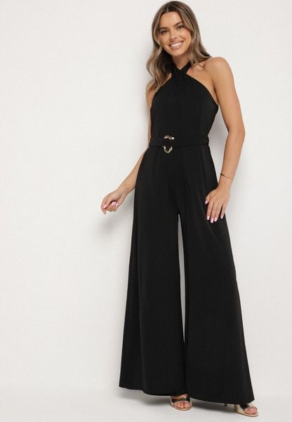Czarny Koktajlowy Kombinezon Wiązany na Szyję z Paskiem Melafela