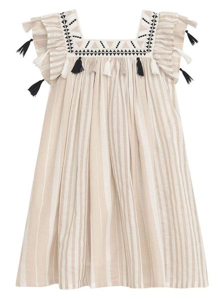 – czysta bawełna- dekolt: karo- krój: rozkloszowany- detale: falbany, frędzle- wzór: paski