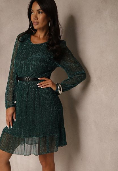 Ciemnozielona Rozkloszowana Wiskozowa Sukienka z Metaliczną Nicią Melanissa