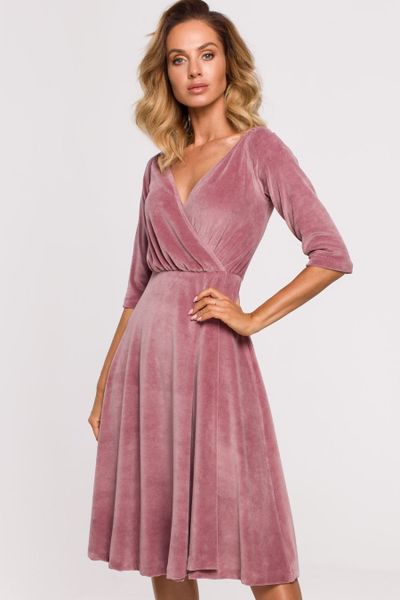 Sukienka welurowa rozkloszowana kopertowa midi z dekoltem V różowa