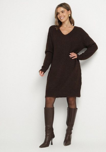 Brązowa Dzianinowa Sukienka z Domieszką Wełny o Pudełkowym Kroju Esmerea