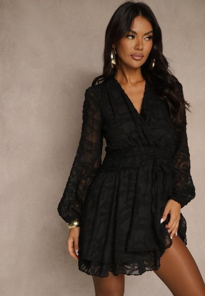 Czarna Rozkloszowana Sukienka z Siateczki z Ozdobnym Tłoczeniem Zenessalia