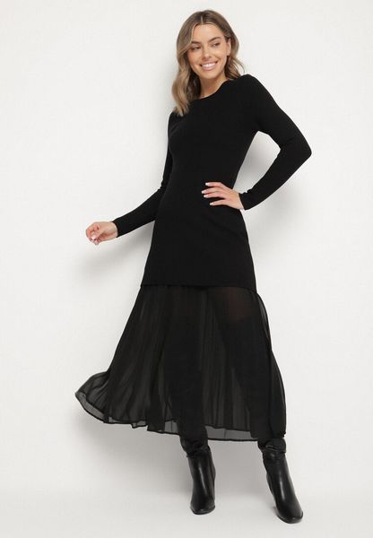 Czarna Dopasowana Sukienka z Wiskozą z Długim Rękawem i Plisowanym Dołem Zenica
