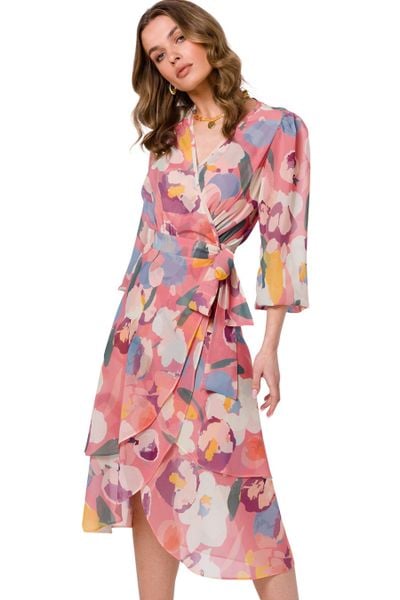 Zwiewna sukienka szyfonowa kopertowa z wiązaniem różowa