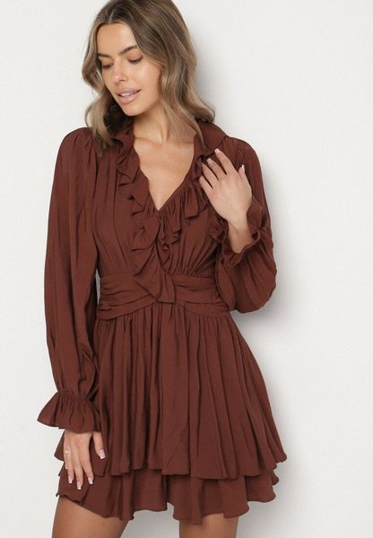 Brązowa Wiskozowa Sukienka o Rozkloszowanym Kroju z Falbankami Vavea