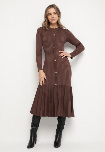 Brązowa Taliowana Sukienka z Wiskozą z Guzikami i Rozkloszowanym Dołem Faratila